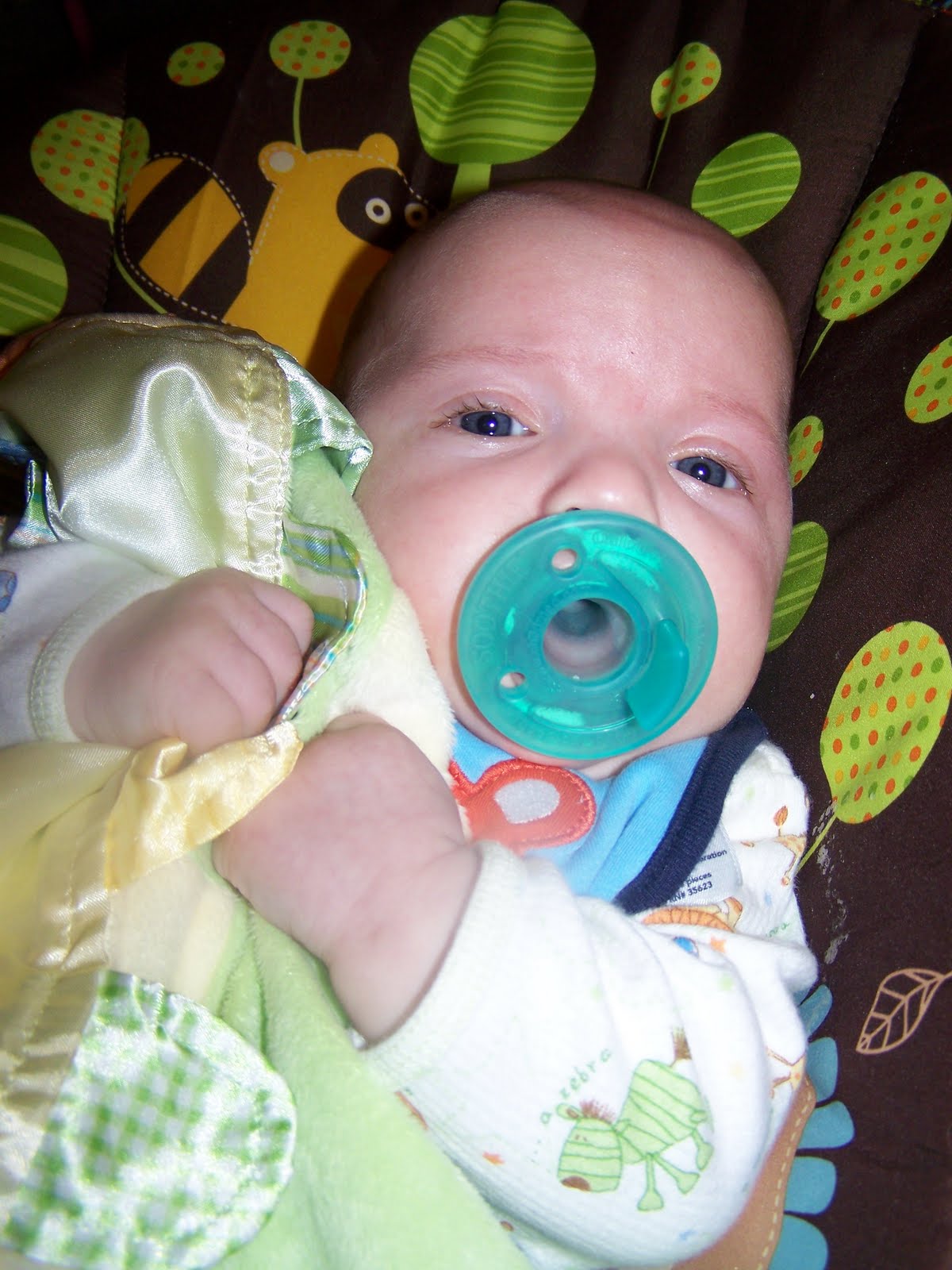 Still very much the Chubba Bubba. He has rolls everywhere. I just LOVE a chubby baby!! He will probably switch to 6mo clothes before the month is out. Henry continues to be our easygoing baby. He will lay contentedly under the play mat for over an hour watching the mobile, looking in the mirror, listening to the music and accidentally hitting a toy. In regards to "actual" age, as opposed to adjusted age (which for them being born 5 weeks early is technically 2 months) Henry is developmentally closer to his real age then either Ella or Grant. This is evident by the greater degree of chatter he emits. He has a adorable smile but unlike Ella makes you work for them. There is nothing in particular that you can do that will elicit a smile every time. He continues to be my only breastfeeder and like Ella has a bit of reflux. He does not like to have bottles as much. Henry is the spitting image of his father, except for his eyes and lips which he gets from me. He also has my shoulder dimples, which I am thrilled to pass on. Most often Henry takes his naps swaddled in the swing, much like his oldest sister did. However, when we try to use that same technique to go to sleep at night he throws a major fit. It's a little odd but whatever works for you Henry. Henry rarely takes a pacifier, preferring his hands instead. Unfortunately, his hands aren't cooperating. I've been attempting to get a video of his attempts at corralling his hands but he isn't cooperating either. What it looks like is Henry using one hand to grab the other to shove into his mouth. It's adorable!
